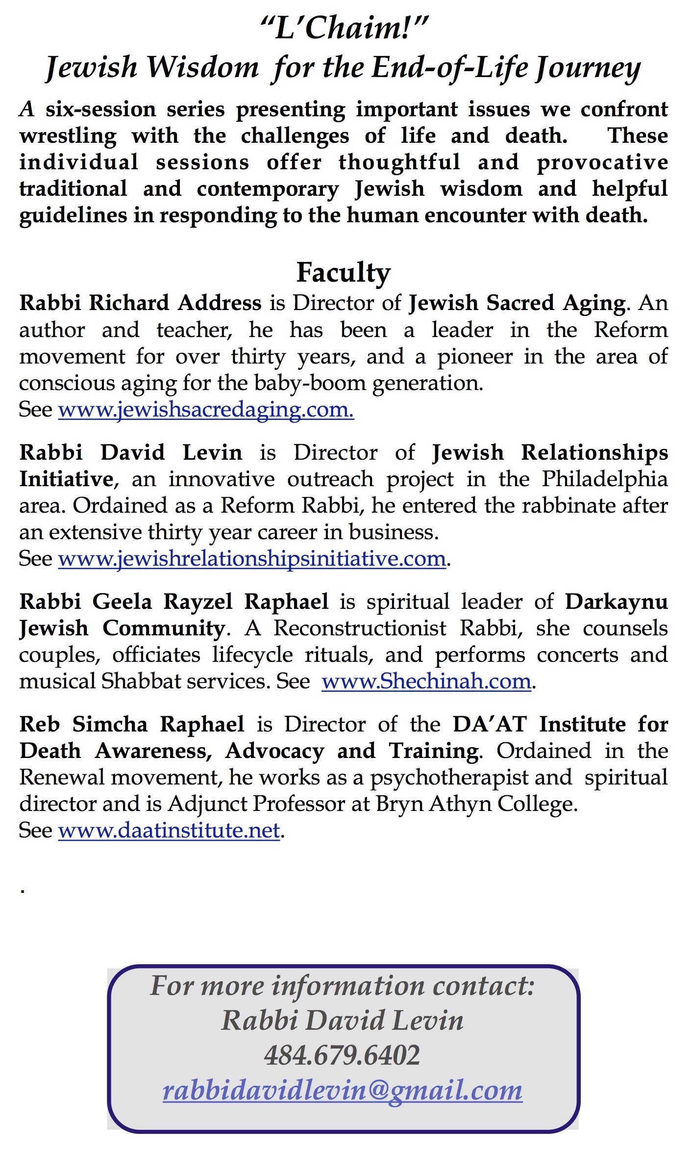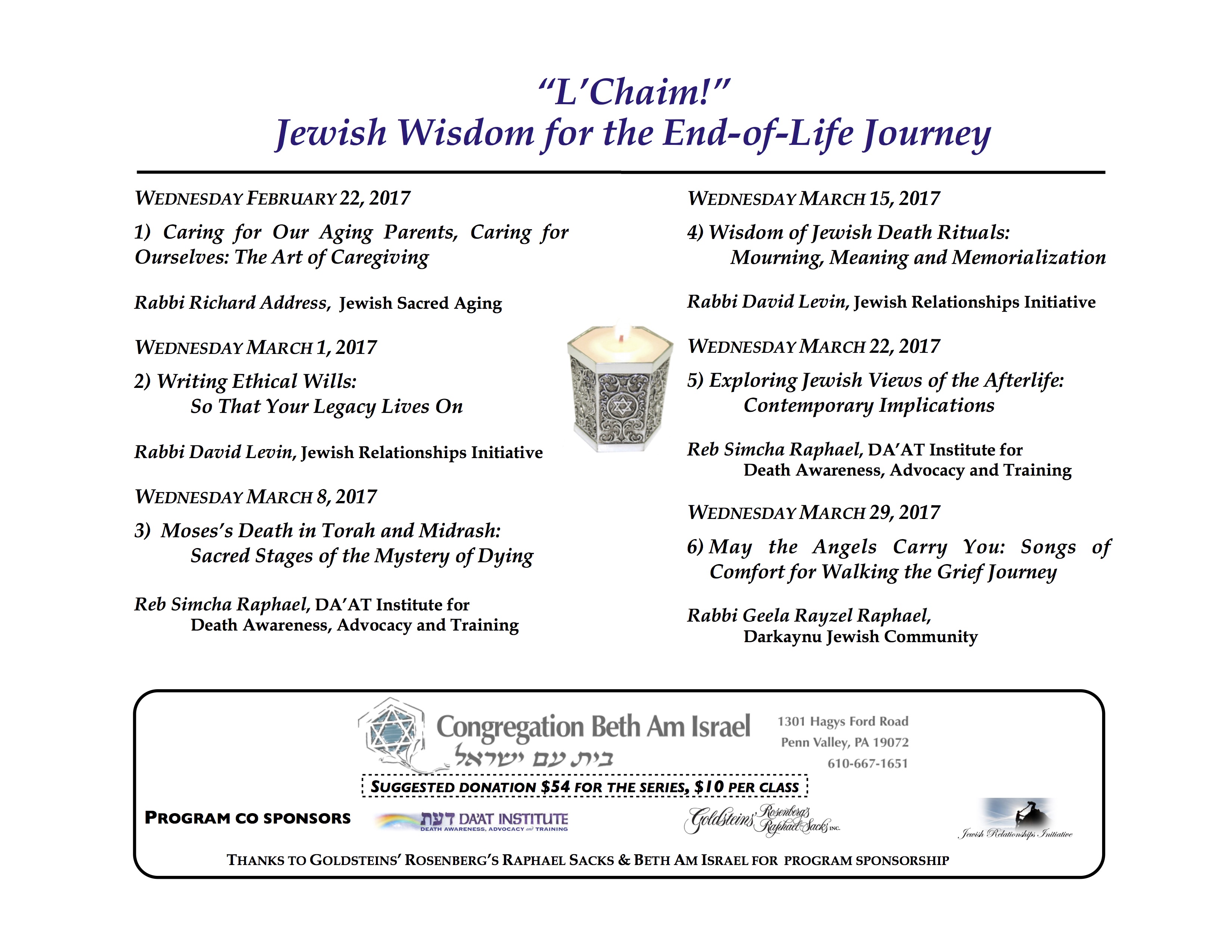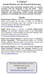 An extraordinary six-session series presenting Jewish insight and wisdom for the most challenging part of life’s journey. Join us at Beth Am Israel for this special opportunity, every Wednesday, February 22 through April 5.