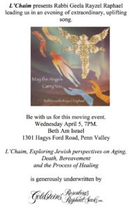 This coming Wednesday, April 5, at 7pm, Join Rabbi Geela Rayzel Raphael, as she leads a fascinating evening of music and conversation. May the Angels Carry You is the title of her newest album of songs to help provide meaning and comfort for walking the grief journey.Come learn with us.
